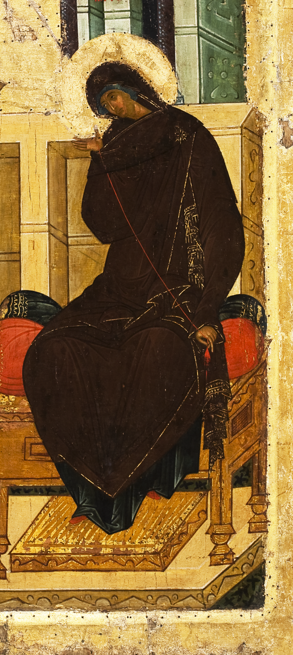 +The Mother of God is depicted either sitting, to emphasise her superiority over Angel or sometimes as standing , as listening to King’s command. As per the rule in Icons, she will be holding a yarn in Her Hands, rarely a scroll. These details are more mentioned in the Proto Gospel of St James.