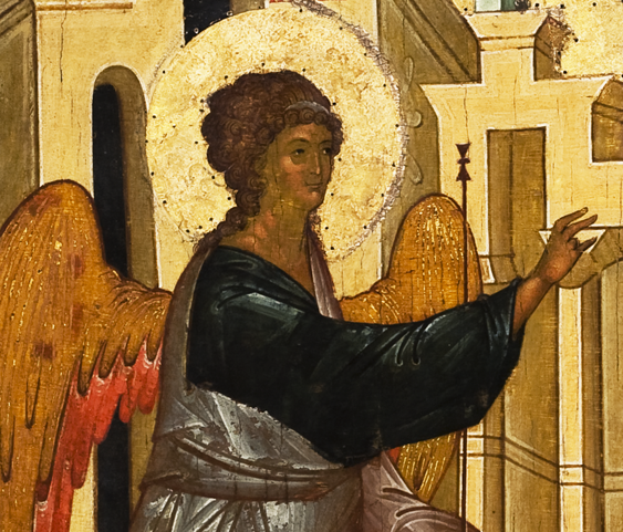 +The majority of Icons depicts Archangel Gabriel in swift motion, he just descended from heaven and looking as a diligent servant intent on carrying out the task given by his Master. His legs are wide apart as though he came running.