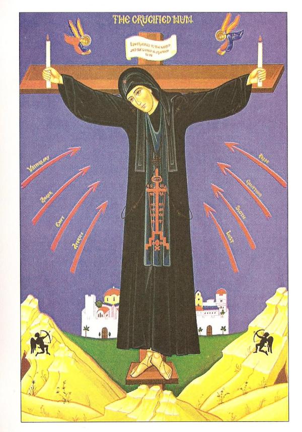 +To the right side of the cross paint a dark cavern with a big dragon in it coiled up, and write: “The all-devouring Hell.” Over the mouth of the dragon is a naked young man with his eyes bound by a cloth, he holds a bow and shoots at the monk. On his bow is a scroll which says: “Maker of lust.” Write this inscription above him: “The love of harlotry.” Above the cave put many snakes and write: “The cares.” Near to Hades put a devil dragging at the cross with a rope and saying: “The flesh is weak and cannot resist.” At the right-hand end of the footrest put a spear with a cross and a flag and write on it: “I can do all things through Christ Who strengthens me.”