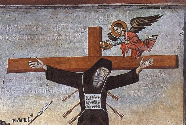 An 18th Century Monk/Iconographer Dionysius of Fourna wrote a manual for Iconographers. One such description is about “The life of a true monk” occupies a prominent part. It represents the true Glory of every monk, of every faithful person and how it is related to voluntary cross-bearing and crucifixion. Below is the English text from “Painter’s manual” by Dionysius along with some Icons/Frescoes depicting it.