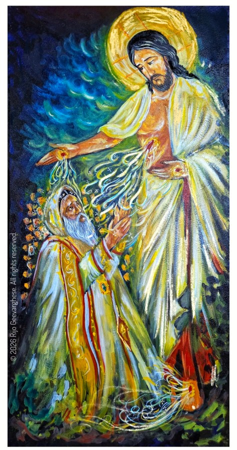 As St. John Chrysostom teaches, “the side of Christ is the beginning of all the Holy Mysteries of the Church” (Homilies on John 85). From that pierced side flows the life of the Church.In the painting below, the Catholicos, the shepherd of the Church, stands with open hands—not to take, but to receive.